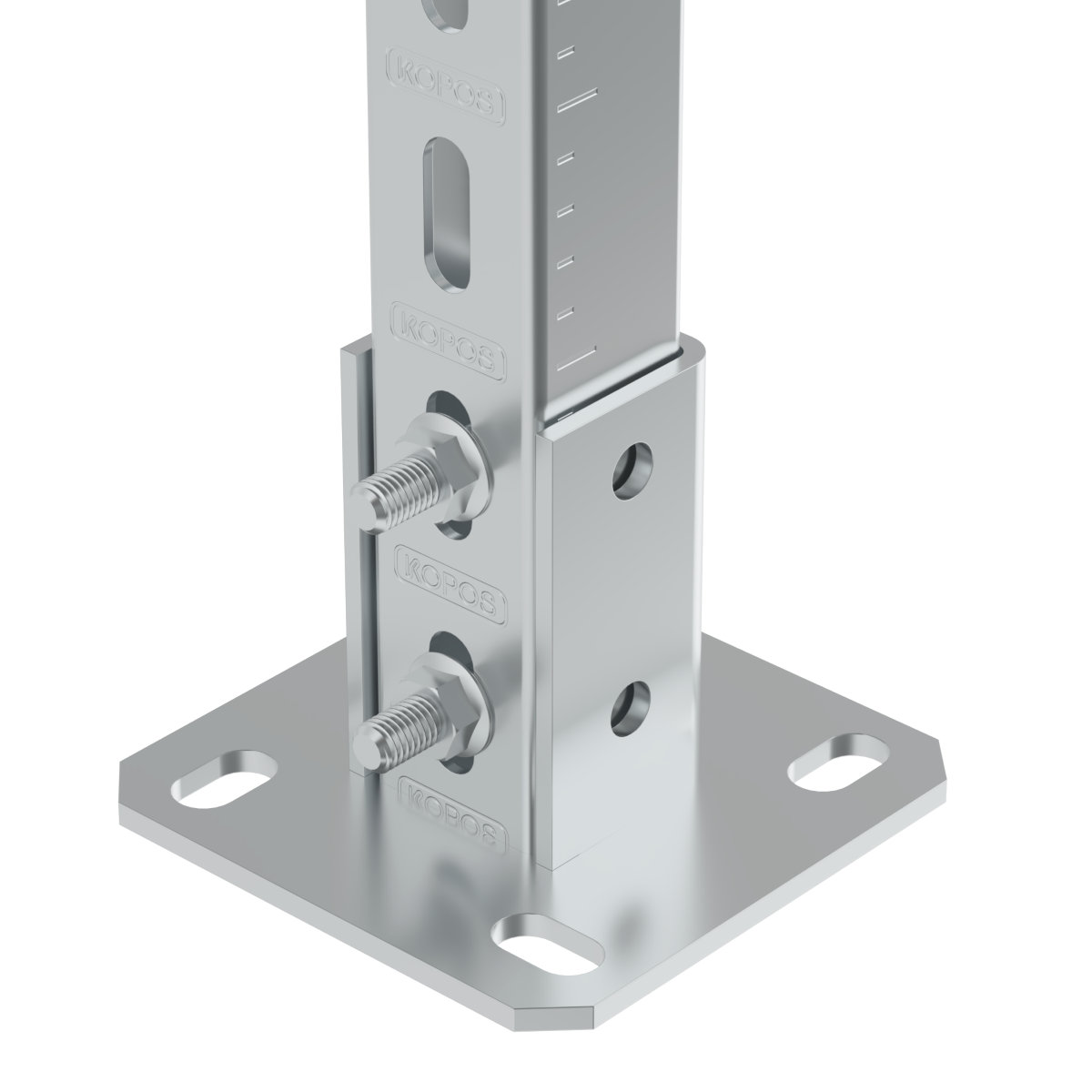 HMP 41_F head is designed for fixing of MP 41X41 or MP 41X21 mounting profiles to the floor or ceiling. The mounting profile MP 41X41 is fixed to the head with two S 10X70 screws, M 10 nuts and PD 10 washers. The mounting profile MP 41X21 is fixed to the head with two S 10X50 screws, M 10 nuts and PD 10 washers. By combining the head and the mounting profile, it is possible to create the ceiling profile (holder) of any length.