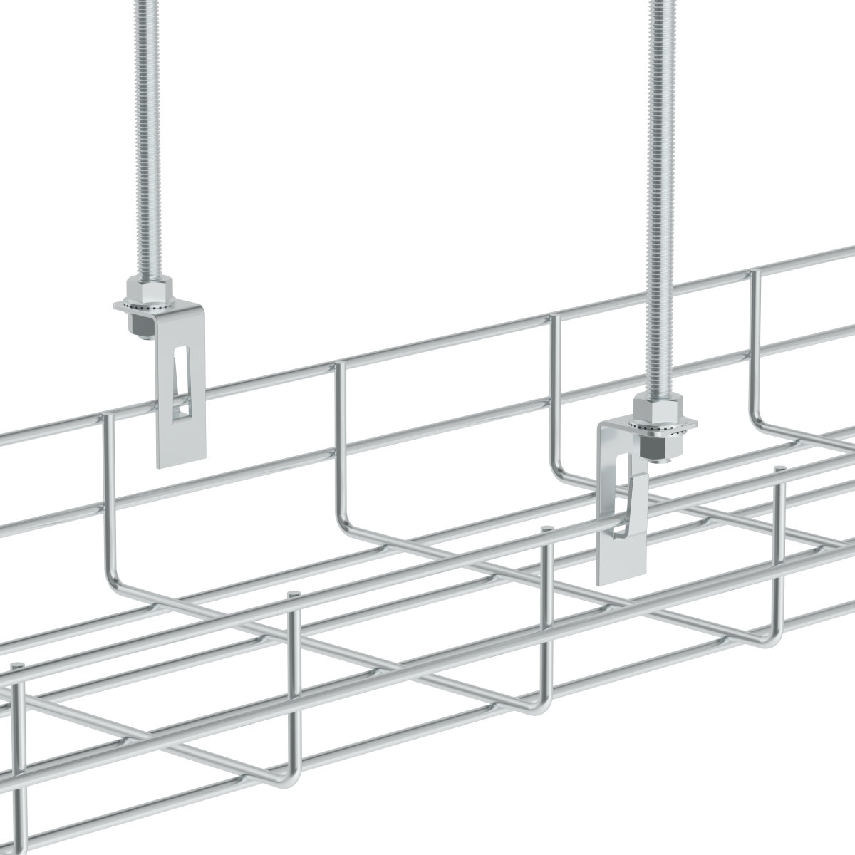 The side hanger is designed for hanging a wire cable tray from the ceiling using a threaded rod Ø 8 mm and two INOXM 8 nuts. The hanger is always used in pairs, the wire tray must be suspended on both sides. The max. recomended load for one mounting point (2 pcs. INOXDZBZ) is 15 kg.